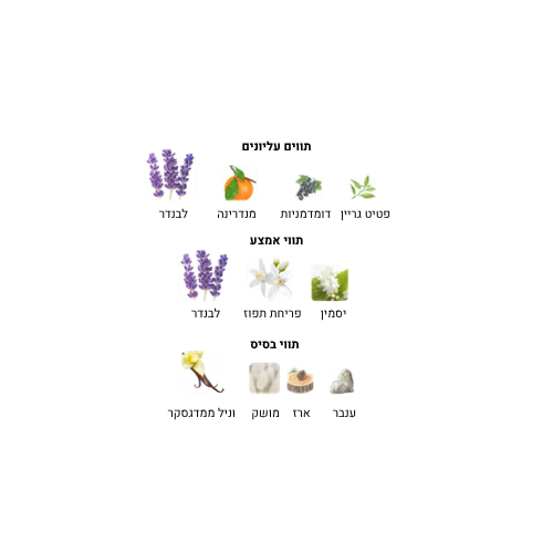 • תווים עליונים: לבנדר, מנדרינה וברגמוט – פתיחה רעננה ומעוררת חושים.