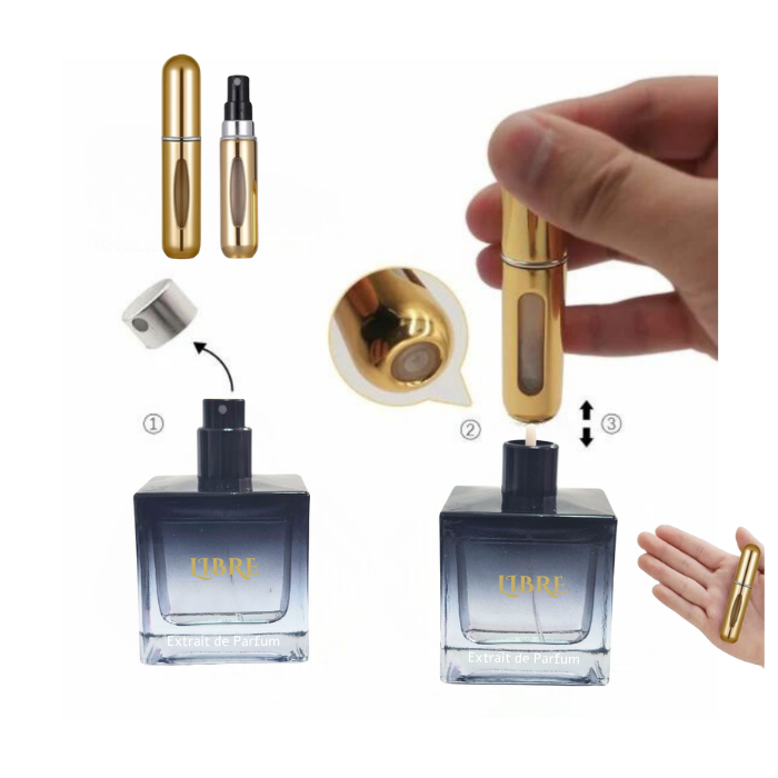הבקבוקון מצויד בטכנולוגיית מילוי פשוטה וגאונית. אין צורך במשפכים או בציוד מיוחד: פשוט מסירים את ראש הריסוס של בקבוק הבושם המקורי, מצמידים את תחתית המיני-בקבוקון לצינורית, ולוחצים מספר פעמים עד למילוי רצוי.