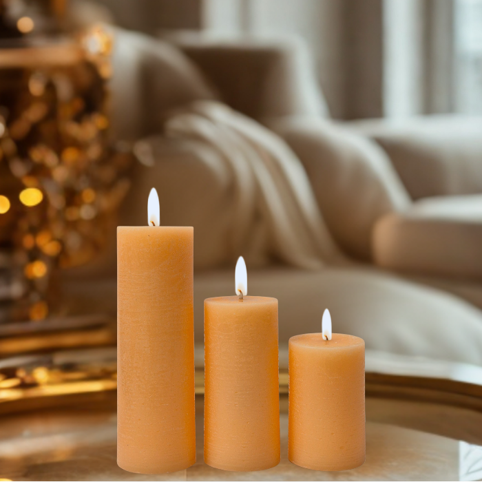מפרט טכני: הסט כולל שלושה נרות עמוד (Pillar Candles) במידות הבאות: